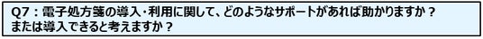 電子処方箋導入の為にあったら嬉しいサポートは、「システムサポート」や「導入費の資金の補助」、「患者の認知度向上に向けたサポート」といった意見が挙げられました。