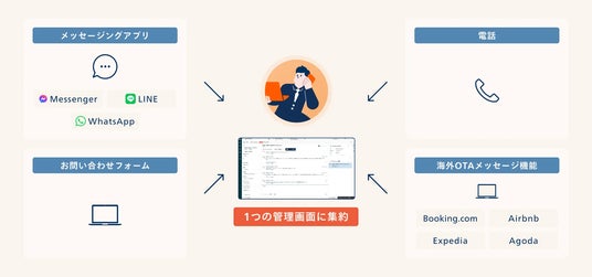 電話、LINEやWhatsapp等のメッセージアプリ、問合せフォーム経由のメール、海外予約サイトメッセージ機能などの様々な問合せチャネルを独自の連携方法で一つの管理画面(Zendesk)に統合します。これにより、様々な問合せチャネルからくるゲストからの連絡を一目で漏れなく確認できるようになります。