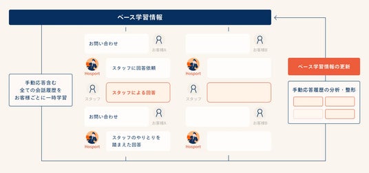 Hosportは人と一緒に働くことを前提とした、独自のAI学習モデルを採用しております。特定のゲストとの会話履歴は人間スタッフの補足回答も含めて、そのやりとりにおいてのみ記憶することから、セキュリティを保ちながら、スムーズな会話ラリーが実現可能です。そして、AIコンシェルジュによる応答、ホテルスタッフによる手動応答履歴全てをデータベースに記録してくことで、定期的なAI学習情報のアップデートを行い、AI解決率を向上させていくことも可能です。