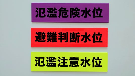 河川氾濫の危険度を見える化。蛍光色の避難目安の水位ラインで早めの避難を!「水位警戒プレート」を貼りかえる事で河川改修による基準水位変更にも対応
