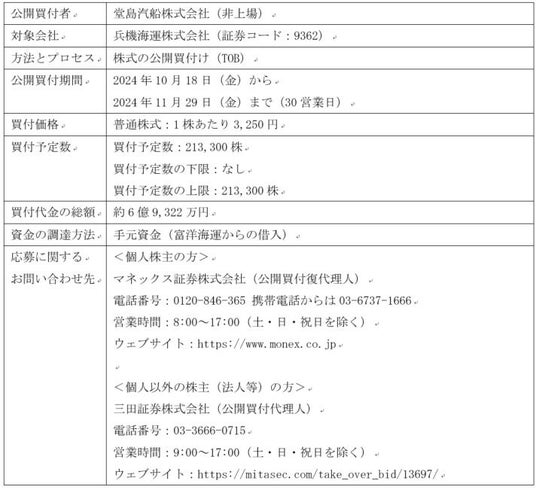 株式会社富洋海運(代表取締役 久保大介、以下「富洋海運」)の完全子会社である堂島汽船株式会社(代表取締役 久保大介、以下「堂島汽船」)は、2024年10月17日、兵機海運株式会社(証券コード:9362、東京証券取引所スタンダード市場、以下「兵機海運」)との資本業務提携の実現に向け、兵機海運の普通株式の一部(兵機海運の自己株式を除く。以下同様。)を、金融商品取引法(昭和23年法律第25号。その後の改正を含みます。)による公開買付け(以下「本公開買付け」)にて取得することを決定しましたので、お知らせします。