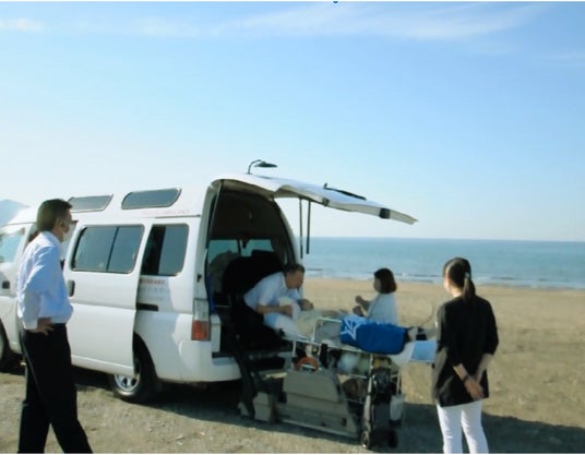 砂浜に停まる介護タクシー。家族が母親に話しかけている。