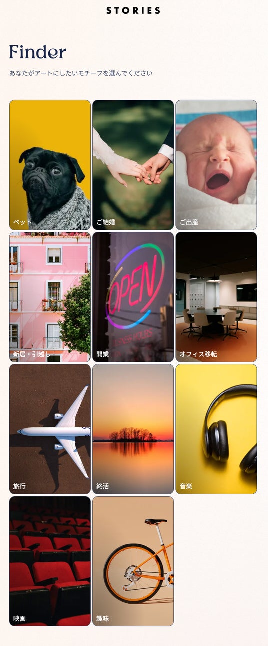 STORIESでは、この課題を解決するために、ライフイベントやお客様の関心事、物事に合わせて作品シリーズをマッチングするFinderシステムを開発しました。