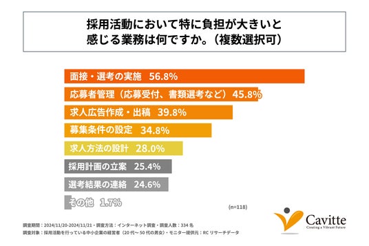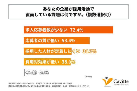 中小企業庁の「2024年版 中小企業白書」(https://www.chusho.meti.go.jp/pamflet/hakusyo/2024/chusho/b2_1_1.html)によると、現在中小企業が優先度が高いと考えている経営課題の1位は「人材の確保」であり、「求人難」が一段と深刻化していることが示されています。また、資本的にも人的にもリソースが限られる中小企業では、採用活動が大きな負担となっていると考えられます。そこで、株式会社Cavitteは、採用を行っている中小企業の経営者を対象に「採用活動」に関する調査を実施しました。