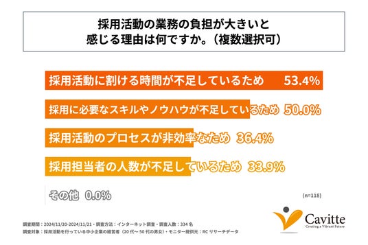 調査の最後、採用活動の業務は負担が大きいと感じると回答された方に「採用活動の業務は負担が大きいと感じる理由は何か」を尋ねる設問への回答では、1位が「採用活動に割ける時間が不足しているため」で53.4%、次いで2位が「採用に必要なスキルやノウハウが不足しているため」で50.0%という結果になりました。この結果から、採用活動をしている中小企業が採用活動の業務は負担が大きいと感じる主な理由は、時間やスキル、ノウハウが不足しているため、であることが判明しました。
