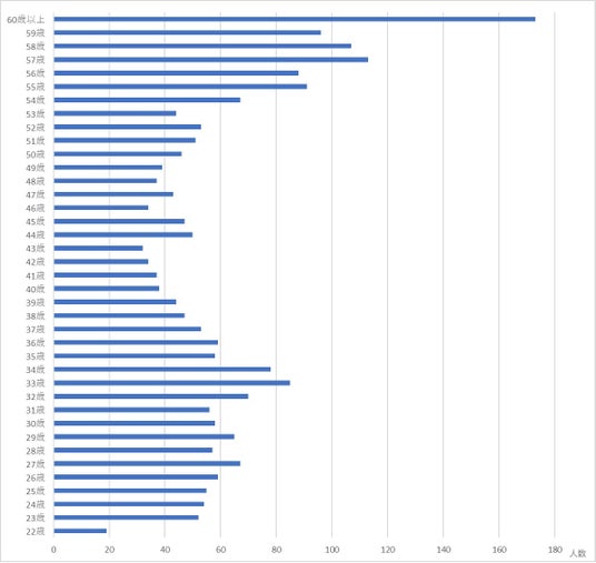 徳島県小学校教員の年齢構成(令和5年度現在/徳島県教育委員会保有情報から鳴門教育大学でグラフ作成)