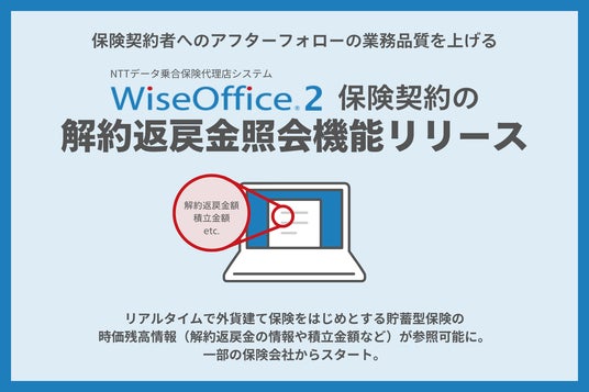 乗合保険代理店業務の顧客・契約管理を支えるクラウドサービス「WiseOffice(R)2」では、これまでも20年以上にわたり、保険代理店の顧客本位の業務運営実現を目指し、サービスを提供してきました。為替変動等による外貨建て保険のニーズの高まりにより、さらに細やかなアフターフォローが求められる昨今の外部環境を踏まえ、WiseOffice(R)2への新たな標準機能拡充として、insurance API PORT(R)の解約返戻金照会機能を無償で提供します。
