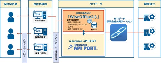 保険業界向けAPI管理基盤であるNTTデータ「insurance API PORT(R)注1」と連携し、APIを活用することでリアルタイムに情報を取得します。保険募集人は、WiseOffice(R)2の契約検索画面から対象契約を選択するだけで、保険会社が提供する対象契約の時価残高照会(解約返戻金の情報や積立金額など)が照会できます。一部の保険会社よりサービスを開始し、随時、提供保険会社を拡大します。