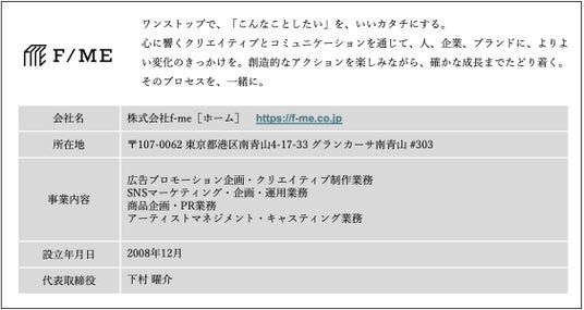 株式会社f-me 担当:石渡・⾊摩・堀澤 TEL: 03-5772-3681 MAIL: info@f-me.co.jp
