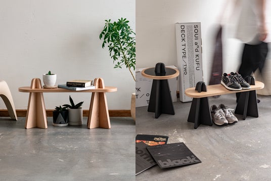 DECK TYPE - TWO は、デッキと呼ばれる天板の×型開口部に、2枚の台形プレートを組み合わせた脚部を差し込むことで、アイコニックな突起部が2つ出現し多用途なベンチ型のスツール兼シェルフが完成します( 特許庁 / 意匠権の登録済み )