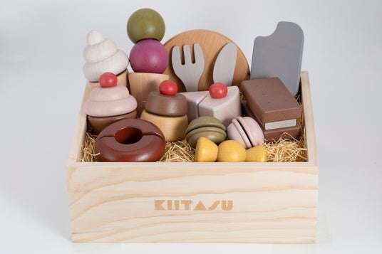 KIITASUのおままごとは切って遊ぶだけでなく、カラカラと音が鳴るお塩でお野菜に味付けをしたり、 ティーポットで紅茶を注いで、スイーツセットと一緒にティータイムを楽しめるなど、子どもたちが飽きずに遊び続けられる工夫が詰まっています。