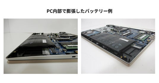 2026年4月施行の改正資源有効利用促進法では、リチウムイオン電池の回収義務化や製品の長寿命化が焦点となっています。またPCの薄型化・経年劣化に伴い、バッテリーが膨らみ、キーボードやタッチパッドを物理的に破壊する「バッテリー膨張」の相談も増加傾向にあります。
