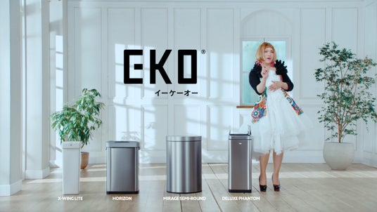 CMでは、IKKOさんが「EKO(イーケーオー)?」の名前に戸惑いながら登場。「ゴミ箱の大革命!」というインパクトあるキャッチに興味を持ち始め、EKOの自動開閉ゴミ箱に手をかざして試してみると、その便利さと清潔さに感動します。