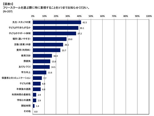 フリースクールの選択で重視するものを尋ねたところ、「先生・スタッフの質」が最多の41.5%。次いで新しい居場所の検討時と同じく「子どもが行きたがるか」が39.1%「子どものサポート体制」が37.2%でした【図表9】。