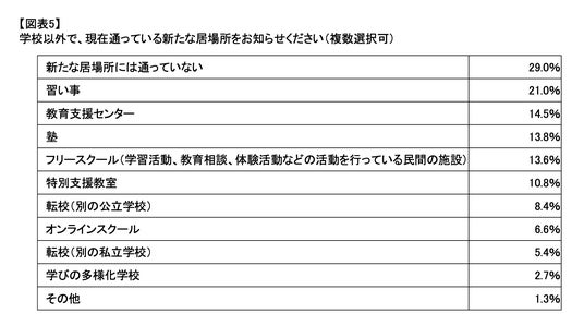 「新たな居場所には通っていない」が最多の29.0%。次いで「習い事」が21.0%、「教育支援センター」が14.5%、「塾」が13.8%。検討したことがある中でトップだった「フリースクール」は13.6%にとどまりました。