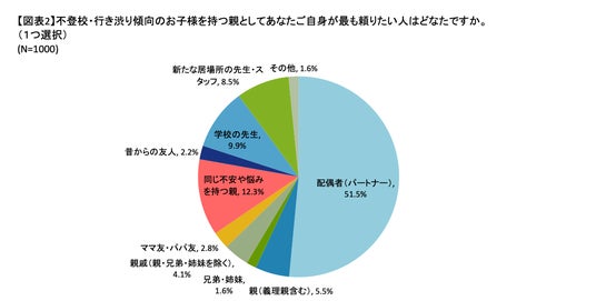 また、家庭とのコミュニケーションの中には、配偶者(パートナー)との意思疎通も含まれます。不登校や行き渋り傾向の子どもがいる親として最も頼りたい人を聞いたところ、半数以上が「配偶者(パートナー)」を挙げました【図表2】。