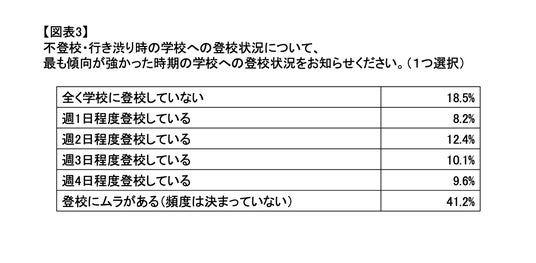 「全く学校に登校していない」は18.5%と2割弱にとどまりました。最も多いのは「登校にムラがある(頻度は決まってない)」で41.2%でした。