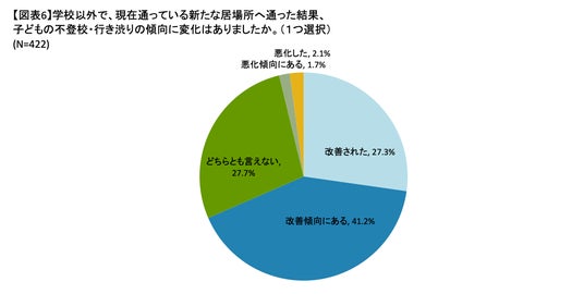 学校以外で現在通っている新たな居場所へ通った結果、子どもの不登校・行き渋りの傾向に変化があったか尋ねたところ「改善された」「改善傾向にある」と答えた人は68.5%に上りました。一方「悪化傾向にある」「悪化した」と答えた人は3.8%にとどまりました【図表6】。