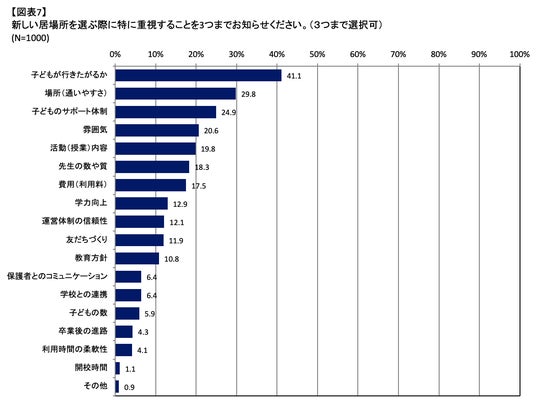 新しい居場所の選択ポイントとして特に重視することは「子どもが行きたがるか」が最多の41.1%となりました。次に「場所(通いやすさ)」が29.8%、「子どものサポート体制」が24.9%でした【図表7】。