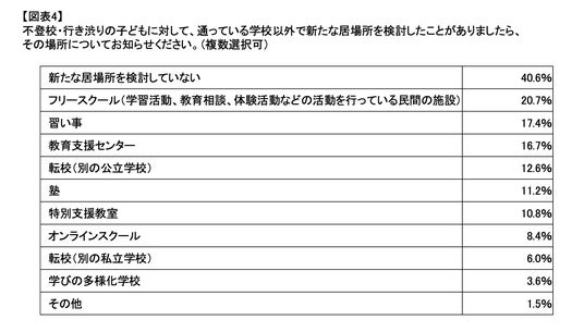 - 全く学校に登校していない子どもは18.5%。子どもの新たな居場所は「検討したことがない」が最多の40.6%。検討している中では「フリースクール」が一番多く、「学びの多様化学校」は3.6%にとどまった。