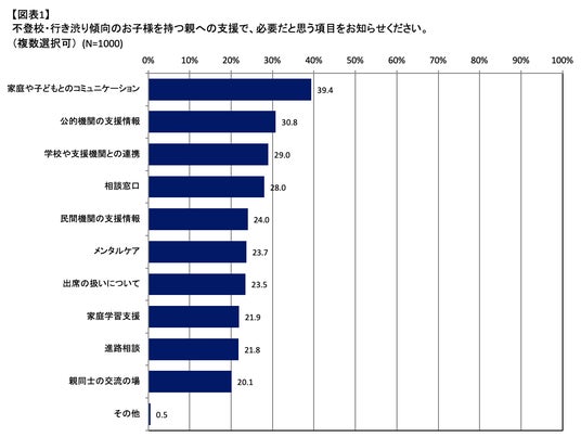 不登校の子どもを抱える親に対し、どんな支援を希望しているかを尋ねた結果、最多の39.4%が「家庭や子どもとのコミュニケーション」を挙げました【図表1】。