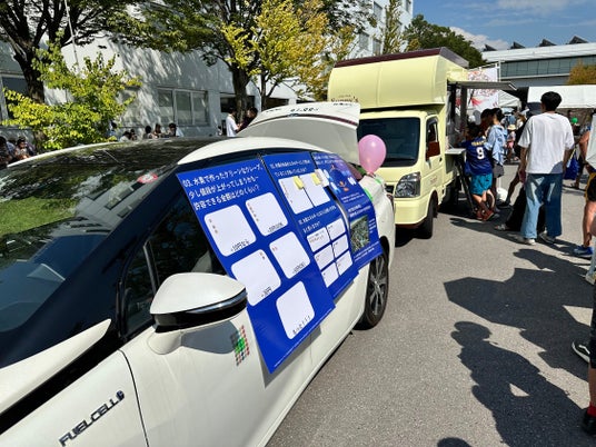 水素自動車から電気を供給し、クレープのキッチンカーを動かしている様子。水素について理解できる展示や、アンケートも実施しました。