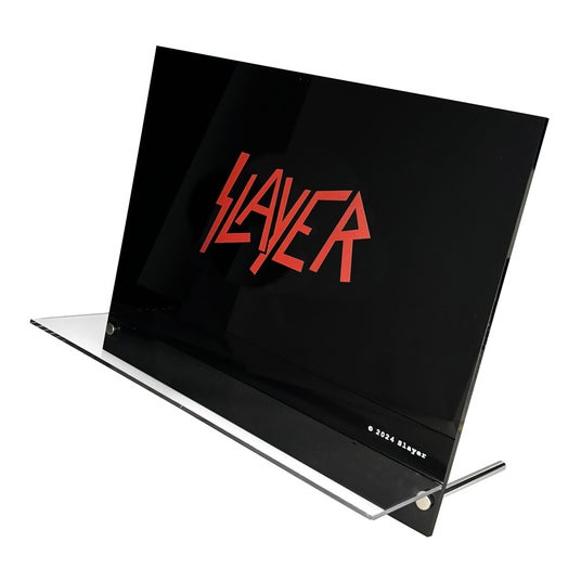 卓上メガネディスプレイ”SLAYER”のロゴが入ったアクリル製卓上ディスプレイ