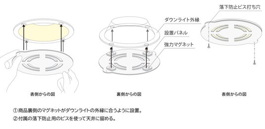 今あるダウンライトの鉄製の縁にダウンライトキャップの裏側にあるマグネットを合わせて設置するだけで簡単に設置、LEDの交換など、電気工事は不要です。