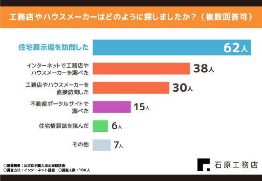 注文住宅購入において、どの工務店やハウスメーカーを選ぶかは非常に重要です。本調査では、「住宅展示場を訪問した」が62%で最多の回答を得ました。多くの購入者が、実物を見て体感しながら比較検討することを重視していることが分かります。