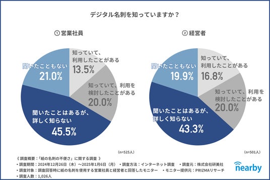 全員に、「デジタル名刺を知っていますか?」と質問したところ、営業社員と経営者で以下のような回答結果になりました。