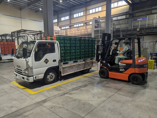その後、自動倉庫で一時保管されたみかんは、市況や注文状況と照らし合わせながら順次出荷され、トラックが各市場へと運んでいきます。1パレットには8キロ入りダンボールで84箱、トラック1台には一度に16パレットを載せることができます。(約10トン)1ケースにはMサイズのみかん、一つ100グラムが約80個ほど入っているので、トラック1台の中には約10万個のみかんが入っていることになります。