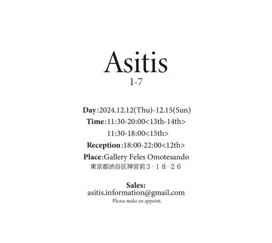 Asitisの初個展[1-7]を、Gallery Feles Omotesando(東京都渋谷区神宮前3丁目18−26 1F) にて、2024年12月12日(木)~12月15日(日)の期間に開催します。