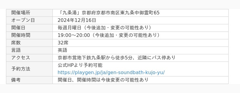 絃は、京都市の歴史ある「九条湯」を舞台に、箏をベースに様々な和楽器とのコラボレーションによる新しい和楽器コンサート『絃 湯響 九条湯 | Gen Soundbath Kujo-yu』をグランドオープンいたします。本コンサートは、訪日外国人観光客向けの日本の伝統音楽と文化をリラックスできる銭湯の空間で深く体験していただけるユニークなイベントです。これは、第一拠点「絃 故郷 西院」に続く第二拠点としてのオープンであり、京都の伝統文化を新しい形で提供します。
