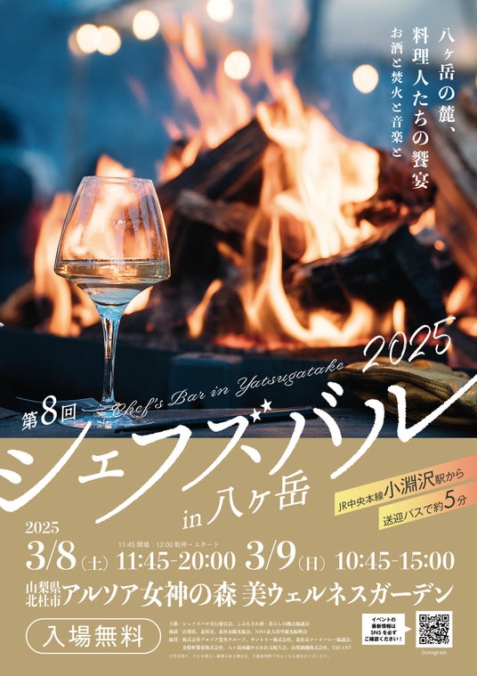 シェフズバル実行委員会は2025年3月8日(土)~9日(日)の2日間、山梨県北杜市「アルソア女神の森 美ウェルネスガーデン」において「第8回シェフズバル in 八ヶ岳2025」を開催します。冬の八ヶ岳は、澄み切った空気、煌めく星空、幻想的な雪景色など、この季節だからこそ感じられる美しい自然が溢れている一方で、寒さが厳しく例年閑散期となってしまうのも実情。