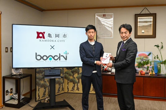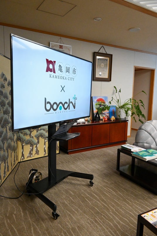 一般社団法人ボンチプラス(代表理事:梁川季久、以下ボンチプラス)は、メンバーの全員が京都府亀岡市役所の公務員であり、「地域で稼ぎ、地域に還元する」ことを目指して亀岡市を拠点に活動しています。令和7年1月9日、事業で得た収益をもとに会議室用の大型ディスプレイ等を亀岡市役所に寄贈し、市職員の働き方改革のために取り組みを進めました。