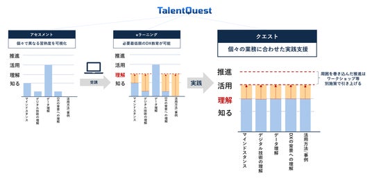 TalentQuestはデジタルスキル標準に完全準拠した講座の中から、アセスメント結果に基づいて個人毎に必要講座をレコメンドする"業界初のDX個別教育プラットフォーム"です。