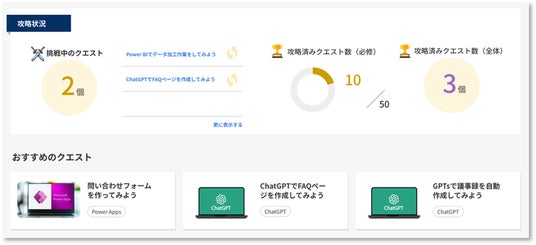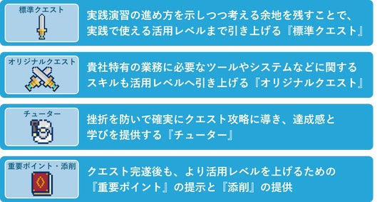 実践演習課題である「クエスト」には4つの特徴があり、攻略することで実践スキル強化の道のりを楽しみながら活用人材の育成が可能です。