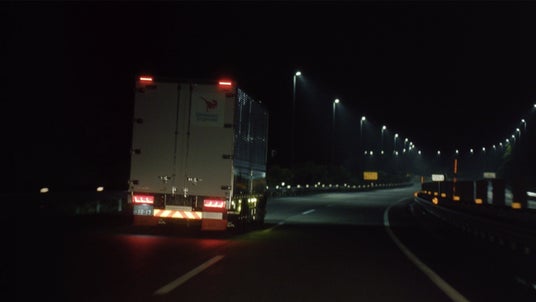 深夜に家族のことを思い浮かべながら鼻歌を歌うトラックドライバー。