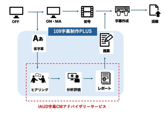 「109字幕制作サービスPLUS」は、これまでの研究成果を反映させ、字幕作成の専門スタッフが多様な聴覚障害当事者(ろう者、難聴者、中途失聴者等)と共に、CMの意図や品質を考慮した上で、字幕表現の評価分析を行い改善点などの提言を行います。字幕制作ワークフローに「IAUD字幕CMアドバイザリーサービス」を組み込むことで、従来の字幕付与サービスに加え、聴覚障害者や聞こえにくさを感じている人及び音声を聞くことができ出せない環境にいる方にさらに配慮した字幕表現が可能になりました。当社では、聴覚障害当事者による支援サービス「IAUD字幕CMアドバイザリーサービス」に賛同し、この取り組みを進めています。