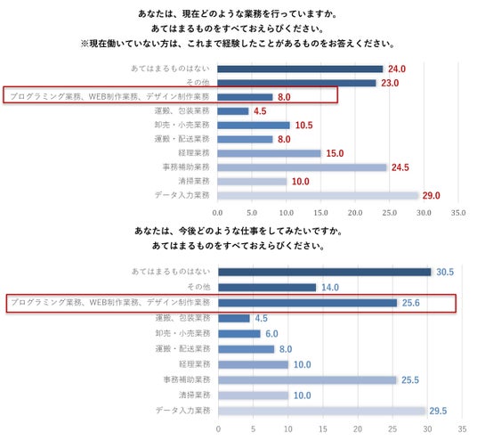 障がい者人材が希望する業務のTOPはクリエイティブ系業務「プログラミング業務、WEB制作業務、デザイン制作業務(25.6%)」で、実態の8.0%と大きく乖離があった。様々な仕事に挑戦できるサポートや環境づくりがカギに。