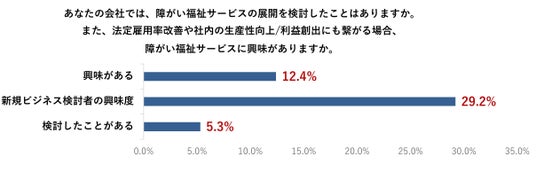法定雇用率の改善と収益創出の両立が期待できる障がい福祉事業に対して、興味があると答えた経営者・個人事業主は12.4%、さらに新規ビジネスの立ち上げを検討している層では3人に1人(29.2%)が興味を示していることが明らかになりました。障がい者雇用と事業拡大の両立を模索する経営者層の潜在的なニーズを見て取ることができます。