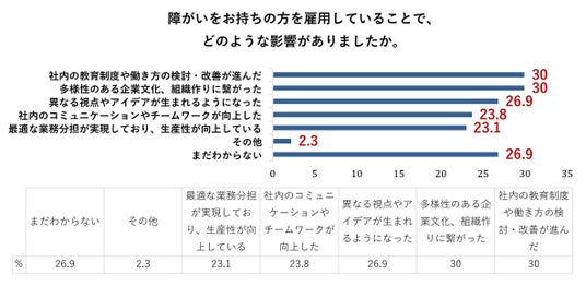 障がい者雇用に取り組む企業の約3割が「社内の教育制度や働き方の検討・改善が進んだ」「多様性のある企業文化、組織作りにつながった」、また23.1%が「最適な業務分担が実現しており、生産性が向上している」と回答しました。これは、障がい者雇用が単なる法令遵守以上の価値を企業にもたらしていることを示していると言えます。