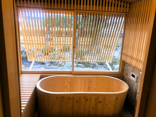 半露天風呂の檜風呂は、壁と天井が檜の格子で覆われています。