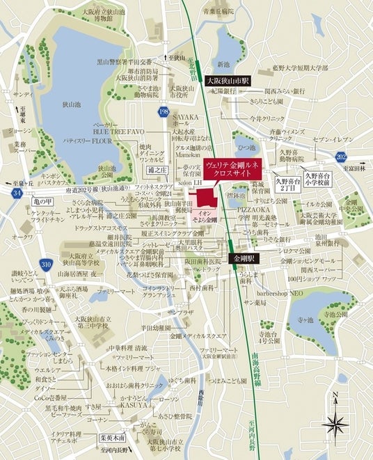 本物件の立地の大きな特徴として、「イオン金剛店(旧ダイエー金剛店)」の跡地であることも挙げられます。1977年の「ダイエー金剛店」の開業から2022年の「イオン金剛店」の閉店まで45年の長きにわたり、地域密着のスーパーは金剛の中心として賑わい、地元の人たちに愛されてきました。惜しまれつつ閉店した「イオン金剛店」の跡地には2024年、イオン「そよら金剛」が開業。そして、その隣に2026年、大阪狭山市最大級のマンションが誕生することで、金剛の中心は新しい歴史を刻み始めます。