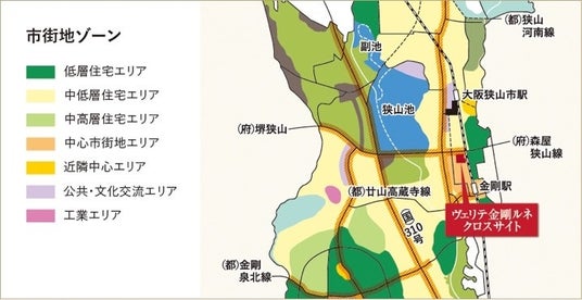 本物件は大阪府南部、大阪狭山市において最大級の総322戸・15階建の分譲マンションであり、新築物件としては南海高野線「金剛」駅最寄りエリアにおいて21年ぶりの分譲となります。その最寄りエリアの中で、本物件が位置するのは駅西側ロータリーの開設以降、新たなまちづくりが進む「新街区」であり、ここは大阪狭山市が令和5年度より推進する立地適正化計画における中心市街地エリアに該当します。その名の通り、大阪狭山市の中心にふさわしい発展が期待される当エリアでは今後さまざまな施設の集積が予定されており、その先駆けとなる「新街区」に本物件は誕生します。