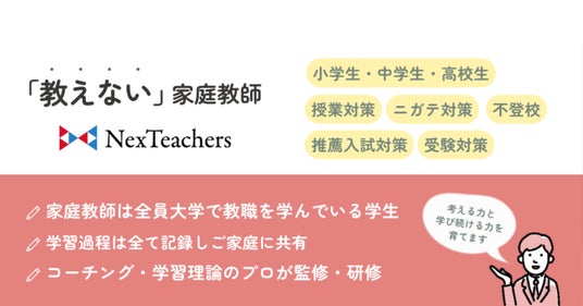 「教えない家庭教師」NexTeachersを通して、未来の教員を養成しつつ、お子さんが「学び方」を学び、自走して学び続けることができるようになることを目指していくソーシャルビジネスです。