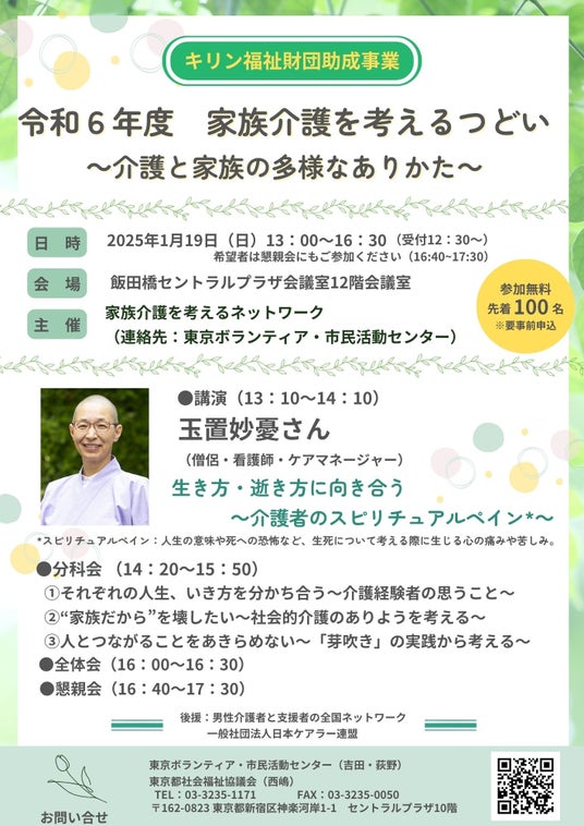 私ども東京ボランティア・市民活動センター(東京都新宿区/所長:山崎美貴子)は「家族介護を考えるネットワーク」とともに、学習と交流を通して家族介護者及び、家族介護者を支援する方々同士のつながりを築き、課題の共有および解決策を考える場として、「家族介護を考えるつどい」を開催いたします。