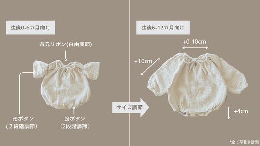 「長く着るための”調節可能なデザイン”を施すことで、赤ちゃんの様々な成長時期やお祝いを共にすることを目的としたベビーウェア」。この発想から、生まれてすぐの退院着に始まり、お宮参り、お食い初めや一歳のお誕生日まで、季節・サイズを気にせず長く着ることが可能な一着が完成しました。