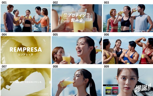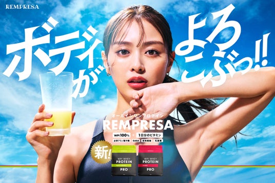 本CMは、REMPRESAが2024年11月から販売を開始しているNEWラインナップ「REMPRESA PRO WPI ホエイプロテイン」の「ライチ味」「白ぶどう味」をメインに訴求する、”ボディがよろこぶっ!!”をテーマにした内容となっています。