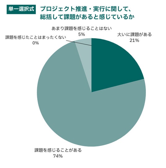 当法人設立に先立ち、プロジェクトをつくる・動かす立場にある方100名を対象にアンケートを実施したところ、実に9割以上が「プロジェクト推進・実行に関して、総括して課題がある」と感じていると回答しました。(「大いに課題がある」と「課題を感じることがある」の合計)